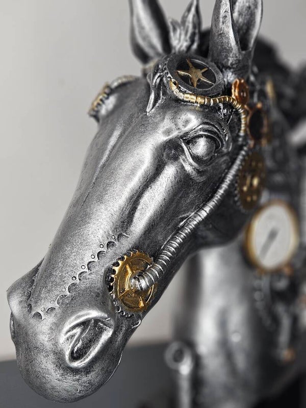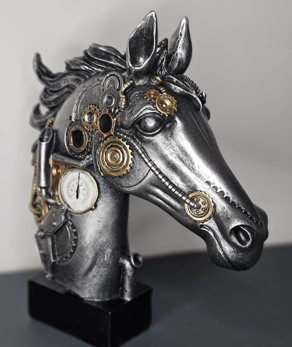 Sculptuur "Steampunk Horse" antiek zilverkleurig met koperkleurige elementen, paardenhoofd op voet.