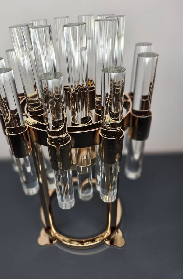 Deze mooie gouden kandelaar geeft een modern tintje aan uw tafel.