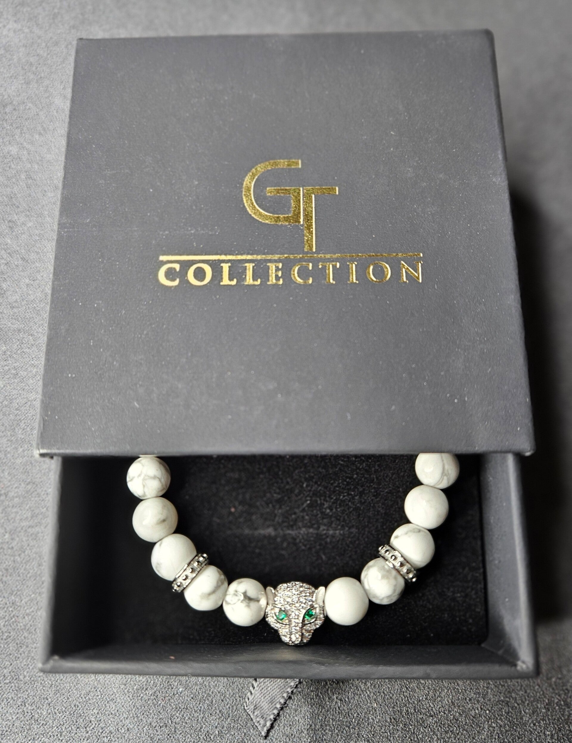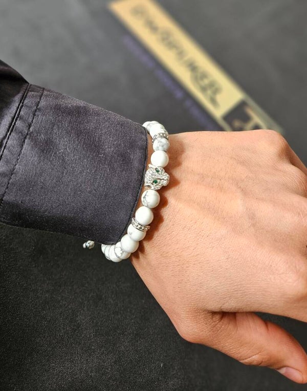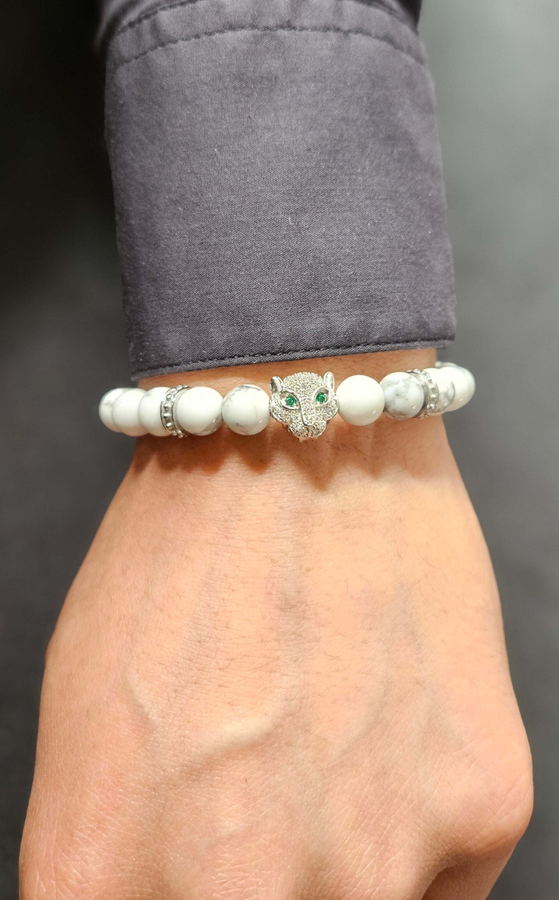Heren WHITE HOWLITE armband met zilveren LEOPARD-hoofd