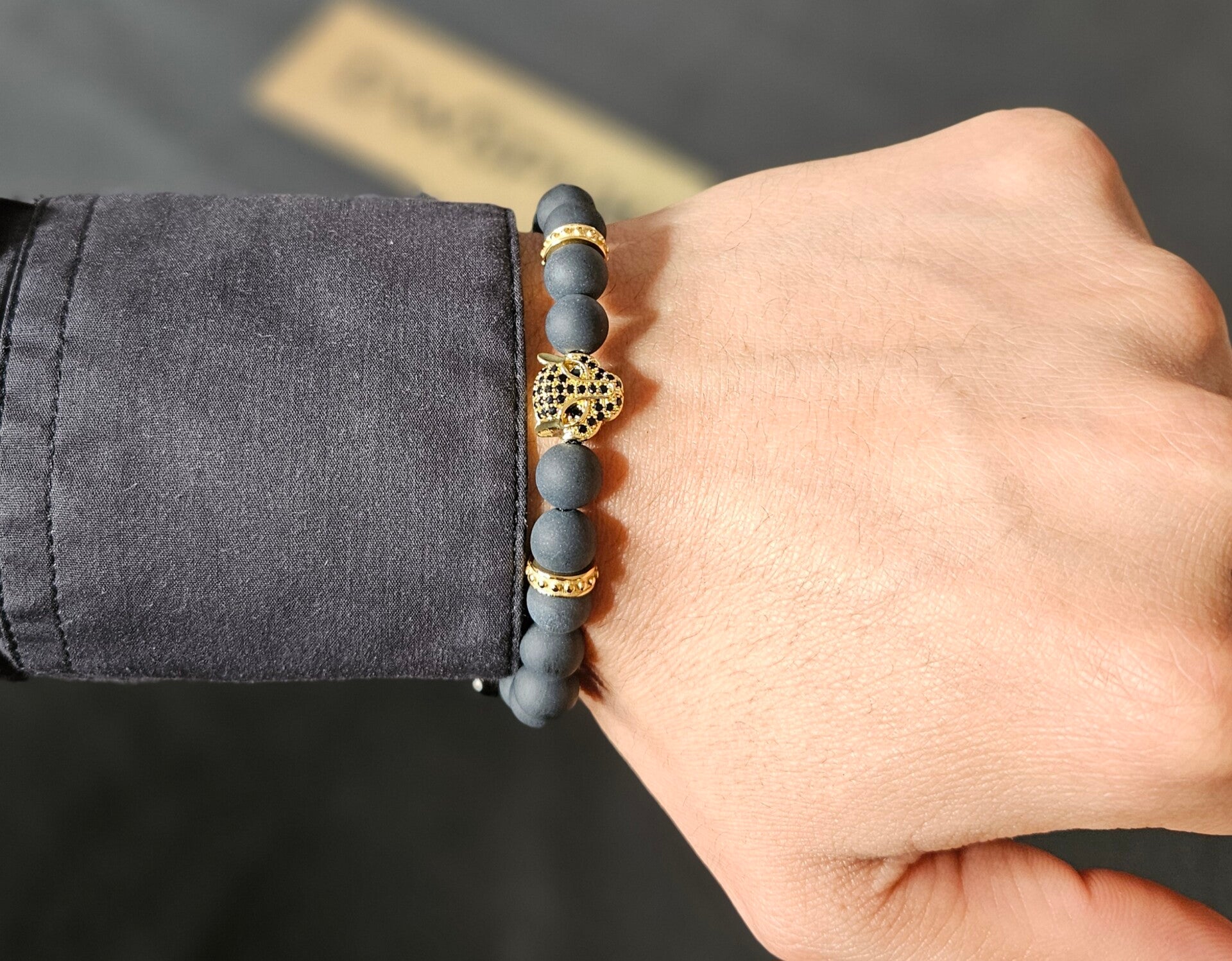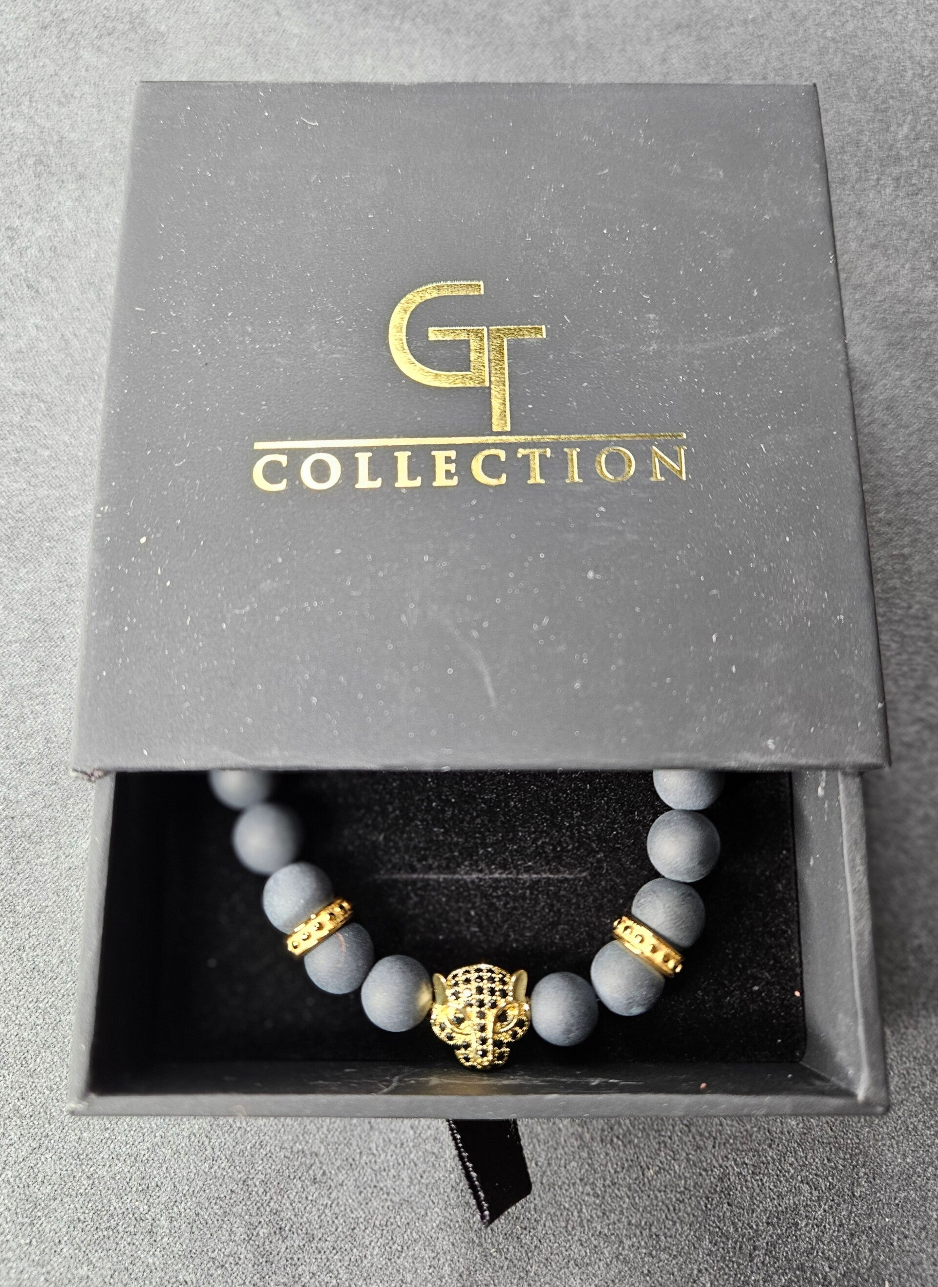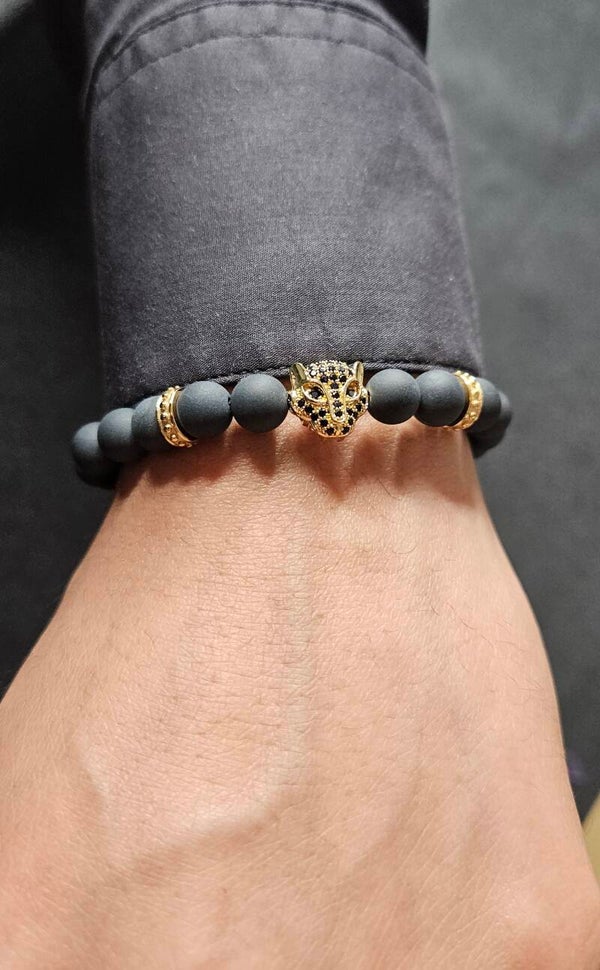 ZWARTE ONYX-armband voor heren met gouden LUIPAARD-hoofd